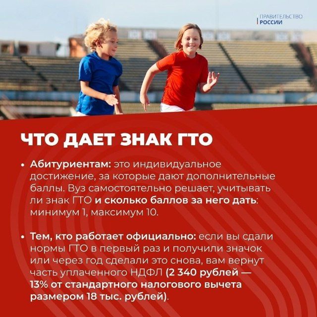 Многие университеты добавляют баллы к ЕГЭ за золотой, серебряный или бронзовый знак отличия ГТО, что повышает шансы на зачисление.